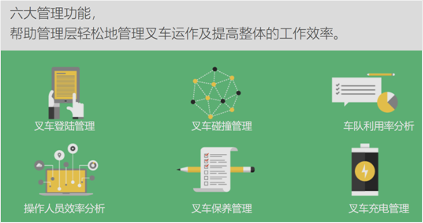 安装在叉车上的智能控制模块内置4G无线芯片,利用4G网络自动无线连接服务器,进行数据收集和管理,并将数据上传至云端后,进行碰撞管理、叉车利用率、员工效率分析、点检登录管理、电池管理、保养管理等功能。