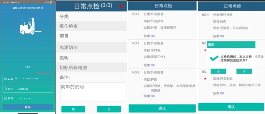 专用APP蓝牙连接叉车进入点检界面,可设置强制点检和点检失败锁车,确保安全无故障即可运行,可向云端传输点检数据