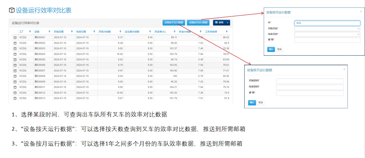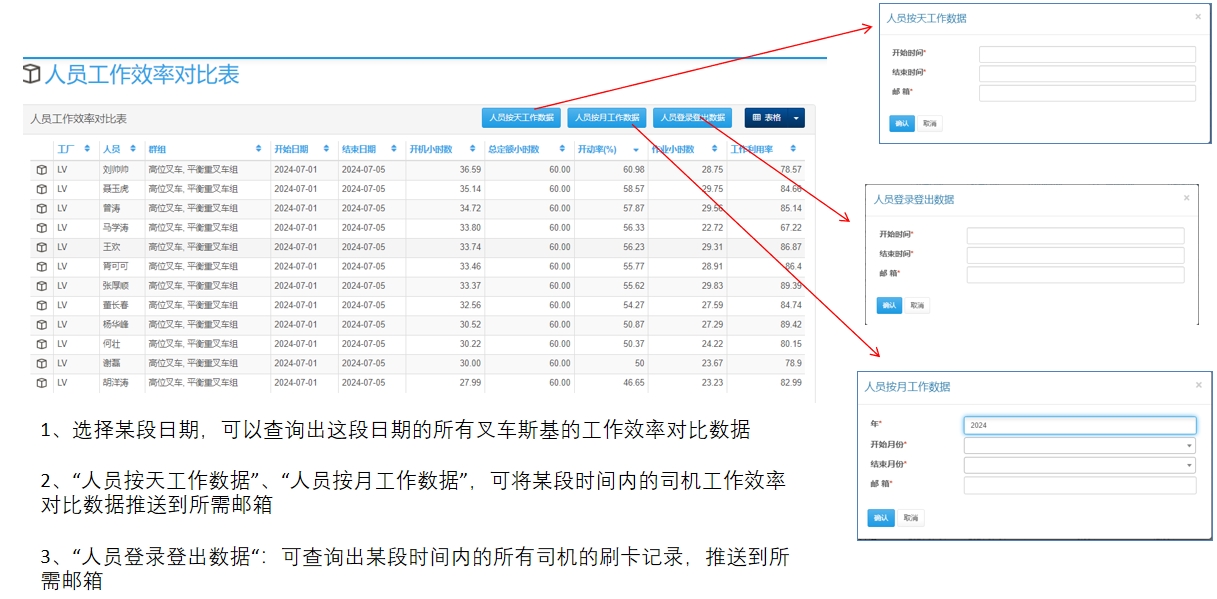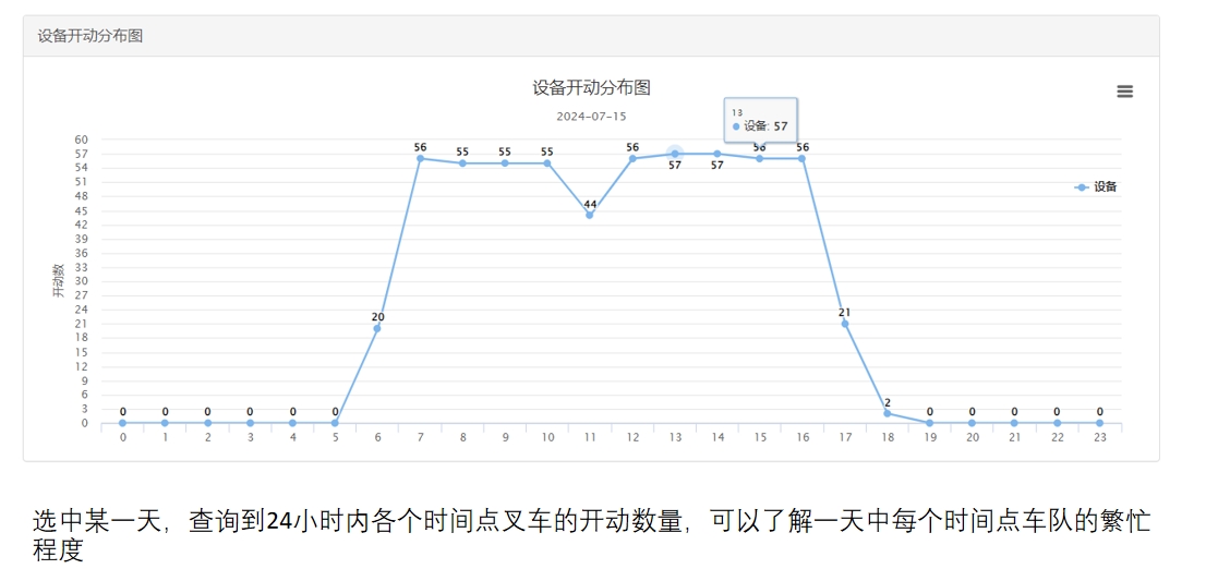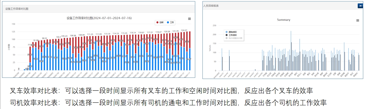可获取叉车的开动情况、实际工作时间及待机时间等,从而分析叉车的利用率,司机的工作效率,使决策者能够优化资源分配,提高整体运营效率